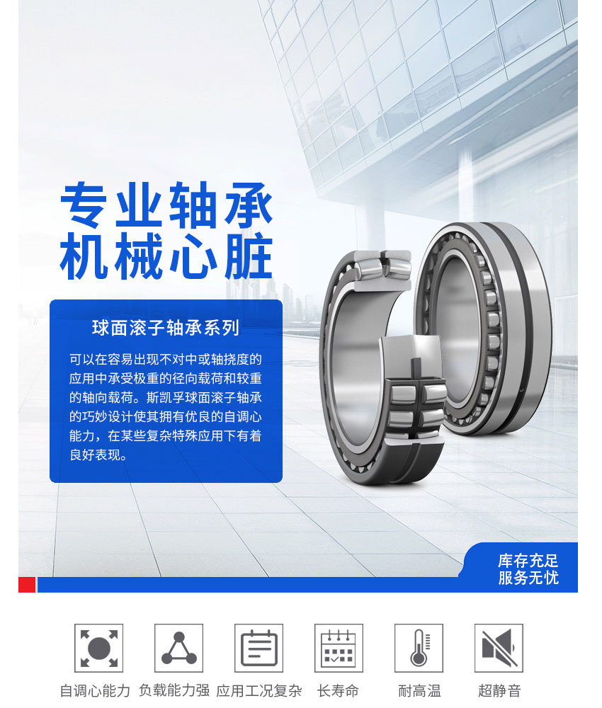 調心滾子軸承具有兩列滾子,一個共同的帶球面外圈滾道和內圈滾道在軸承軸線成一角度傾斜。在外圈的滾道中的球體的中心點是在軸承軸線。因此,軸承,自動調心和不敏感的軸相對于殼體,它可以,例如,軸的撓曲引起的未對準。調心滾子軸承設計用于承受重徑向載荷,以及在兩個方向的軸向載荷重。